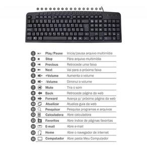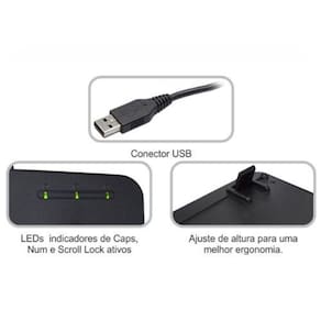 Design moderno o Teclado preto com fio o Padrão ABNT2 o Compatível com Windows XP/Vista/7/8/10 o LED indicador de Num Lock, Caps Lock e Scroll Lock ativados.