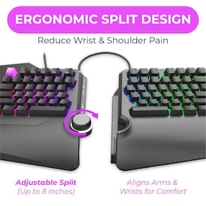 - O design do teclado dividido ajuda a eliminar a dor no pulso e no ombro enquanto você digita. Ao manter suas mãos e braços adequadamente alinhados, este teclado ergo ajuda a fornecer digitação sem dor por mais de 8 horas por dia.