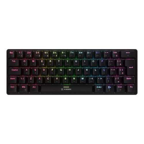 do Teclado Mecânico Gamer sem Fio Fortrek Gravity Air Marca: Fortrek Modelo: Gravity Air (84977) Cor: Preto Layout: ABNT2 (com ``Ç``) - 63 Teclas Formato: Compacto 65% Tipo de Switch: Mecânico - OUTEMU Brown (Tátil) Conectividade (Tri-Mode): 1. Wireless 2.4GHz (Dongle USB) 2. Bluetooth 5.0 (até 3 dispositivos) 3. Com fio (Cabo USB-C removível) Anti-Ghosting: 100% Anti-Ghosting (N-Key Rollover), exceto tecla Fn Iluminação: Rainbow com 20 modos pré-definidos Bateria: Lítio recarregável de 2000 mAh Autonomia da Bateria: Até 10 horas de uso contínuo / Até 360 horas em standby Dimensões: 292 x 102 x 40 mm Compatibilidade: Windows, Linux e Mac OS (Plug and Play) Itens Inclusos: 01 Teclado Fortrek Gravity Air, 01 Cabo USB-C, 01 Manual do Usuário Homologação ANATEL: 00359-25-17485