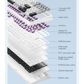 - Teclado cremoso: equipado com 5 camadas de material de amortecimento de som para aprimorar o som da digitação. A combinação de espuma sanduíche, interruptores IXPE, membrana acústica PET, espuma inferior e almofadas protetoras de silicone ajudam a eliminar ecos, proporcionando um som de digitação puro e uma sensação de digitação estável e confortável