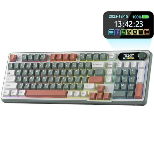 O Teclado Mecânico Royal Kludge RKS98 96% RGB Sem Fio é uma ferramenta indispensável para qualquer amante de tecnologia e videogames que procure qualidade e personalização. Com seu design de montagem superior de 96%, este teclado oferece uma experiência de digitação consistente e agradável, graças à sua estrutura rígida. Conta com 96 teclas e uma conectividade de triplo modo (com fio, sem fio de 2,4 GHz e Bluetooth), o que permite conectar até três dispositivos ao mesmo tempo, facilitando a transição entre diferentes equipamentos sem complicações. A PCB hot-swappable permite substituir os switches sem necessidade de solda, adicionando um nível adicional de personalização. Seus 14 modos de iluminação RGB não apenas embelezam seu espaço de trabalho, mas também podem ser sincronizados com o ritmo da música, criando um ambiente envolvente. Equipado com 5 camadas de espuma amortecedora, o RKS98 reduz o ruído e melhora a acústica de cada pressão. A tela TFT integrada e o botão giratório de alumínio permitem um manuseio intuitivo do teclado e suas funções adicionais. Além disso, a bateria de alta capacidade garante até 130 horas de uso contínuo, fazendo deste teclado um investimento durável e confiável. Principais características: