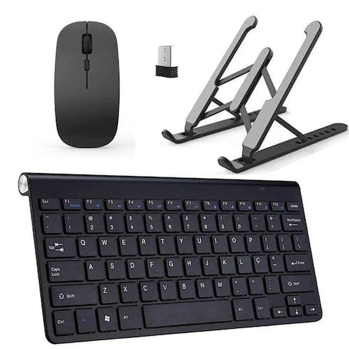 Teclado Mouse Slim e Suporte Preto para Notebook Positivo O Teclado permite que você digite grandes textos com o conforto de um teclado de computador comum. Alcance de transmissão do teclado de até 10 metros, muito compacto, leve, teclado com digitação macia e de belo design. Para conexão ao tablet com adaptador, requer apenas a conectividade wireless junto ao conector enviado. Alimentado por duas pilhas AAA palito(NÃO INCLUSAS). Dados técnicos Mouse sem fio wireless Teclado sem fio Wireless Keyboard Ultra-slim Design com 78 teclas (com teclas de função) Silencioso design, peso leve e fino, fácil de transportarFuncionamento com 2 pilhas AAA ( Não inclusas ) recomendamos usar pilhas alcalinas Modo de Usar: Ligue o teclado colocando as pilhas e após liga-lo haverá conectividade em seu aparelho (mediante a colocação do conector), o mouse conectará automaticamente após a colocação das pilhas e conexão do teclado em seu notebook Itens inclusos 1 Teclado sem fio wireless 1 Mouse sem fio wireless 1 Suporte para Notebook Ajustável