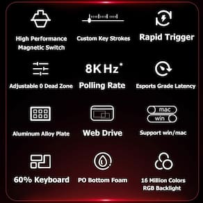 Teclado magnético para máquinas de jogos MADLIONS MAD60HE/MAD68HE No ambiente de jogo competitivo de hoje, escolher um teclado de alto desempenho é crucial. O teclado magnético para jogos da série MADLIONS MAD60HE/MAD68HE é projetado para jogadores que buscam a excelência, tornando-o a escolha ideal para jogadores convencionais. Interruptores magnéticos de alto desempenho. A série MADLIONS MAD60HE/MAD68HE possui interruptores magnéticos autodesenvolvidos, combinados com um driver de placa de rede que não consome memória, suportando taxas de pesquisa de até 8000Hz. Isso significa que cada tecla pode alcançar uma digitalização ultrarrápida de 16K, garantindo tempos de resposta rápidos e dando a você uma vantagem no jogo. - Interruptores magnéticos de alto desempenho: o MAD60HE possui interruptores magnéticos autodesenvolvidos, combinados com um driver de placa de rede que não consome memória, suportando taxas de pesquisa de até 1000Hz, garantindo tempos de resposta rápidos e dando a você uma vantagem no jogo - Mais adequado para jogos FPS: em jogos FPS como Valorant e CS2 que exigem disparo de parada de emergência, os interruptores magnéticos equipados com MADE60 podem permitir que você espie melhor e mais rápido, o que desempenhará um papel na precisão do disparo e posicionamento preciso. Função de assistência óbvia - Tecnologia de disparo rápido: a série tem uma distância de passo RT de até 0,02 mm, oferecendo tempos de resposta extremamente rápidos que ajudam os jogadores a manter uma vantagem competitiva em partidas intensas. Seja disparo rápido ou ações combinadas complexas, a MADLIONS garante uma experiência incomparável - Ação ajustável: o MAD60 HE vem com um driver patenteado baseado na web que permite aos usuários remapear facilmente chaves, configurar macros e personalizar efeitos de iluminação - Design 60% compacto: este teclado de 60% para jogos tem um tamanho pequeno e é bom para todos os ambientes, jogos de viagem de negócios, uso doméstico, sem teclado numérico, mais prático para jogadores e digitadores, dá mais espaço à sua área de trabalho - Iluminação RBG personalizada: o design da posição da luz inferior melhora o efeito de exibição das teclas impressas na lateral. Ele também usa um design de iluminação RGB de 16 milhões de cores, que suporta uma variedade de equivalentes personalizados ajustáveis para melhorar o apelo visual do teclado