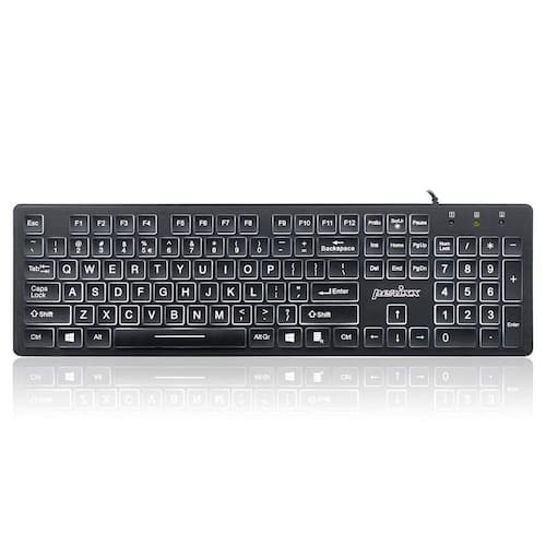 O Perixx PERIBOARD-317 é um teclado USB com fio, projetado com retroiluminação LED branca, ideal para ambientes com pouca luz. Suas teclas retroiluminadas são brilhantes e distribuídas uniformemente, oferecendo uma digitação confortável e fácil. O design das teclas "chicletes" oferece espaçamento para evitar pressionamentos acidentais, e as letras grandes impressas nas teclas aumentam a visibilidade. O perfil do teclado é elegante, com teclas de baixo perfil e uma superfície maior para uma digitação responsiva e silenciosa. O teclado é durável, com uma impressão ABS de alta qualidade que resiste ao desgaste das teclas. Seu interruptor de membrana tem uma vida útil de 5 milhões de pressionamentos de tecla. O recurso plug-and-play oferece uma instalação rápida via USB, com cabo flexível de 6 metros, adequado para várias configurações de uso. Compatível com sistemas operacionais Windows e inclui uma garantia limitada de 12 meses. A retroiluminação pode ser ligada ou desligada, e o bloqueio de rolagem será ativado ou desativado conforme a função de retroiluminação.