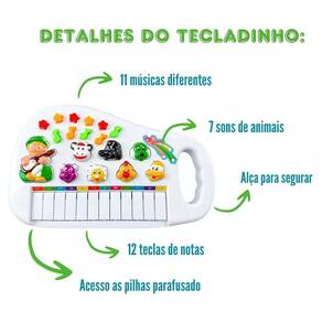 Com o Teclado Piano infantil a criança aprende brincando. Estimula o raciocínio lógico, senso rítmico e melódico por meio da música, trabalha a coordenação visual devido as cores e luzes do brinquedo e coordenação motora por meio das sensações de toque que ajudam no desenvolvimento da inteligência. .