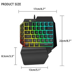 Tipo: Teclado gaming de uma mão Número da chave: 39 (chave) Interface: USB (USB 2.0) Tensão de funcionamento: 5V Plug and Play compatível: Suporte Tamanho: 22x17x2.5cm/8.7x6.7x1.0 polegadas