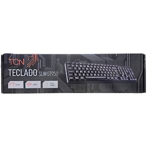 Marca: TCN Modelo: TCN950 Slim ABNT2 Cód.: 67358 Cor: Preto Material: PSU poliestireno Layout: ABNT2, 105 teclas Características: Teclas macias e silenciosas, resistente a respingos dágua Conexão: USB 2.0, plug-and-play Comprimento do Cabo: 1,7 metro Compatibilidade: Windows 9x ou superior , macOS, Linux Dimensões A x L x P : 2 x 10 x 42 cm Peso: 200g Conteúdo da Embalagem: 1 Teclado Slim TCN950 Preto