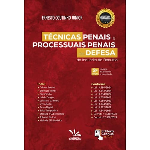 Esta obra é uma ferramenta essencial e indispensável para o operador jurídico. O autor mostra de forma clara, objetiva, simples, dinâmica e, ao mesmo tempo, aprofundada e extremamente atual, pois foi cuidadosamente pesquisado e estudado de forma diferenciada, tendo como principal virtude ser completo, abordando os principais temas do Direito Penal e do Processo Penal. O livro em tela foi dividido nos seguintes capítulos: Das Técnicas Processuais de Defesa; Práticas do Tribunal do Júri; Pacote Anticrime; Tráfico e Porte na Lei De Drogas; Execução Penal; Stalking e CyberstalkingCrime De Perseguição; Lei Henry BorelLei 14.344/2022; Lei Mariana FerrerLei 14.245/2021; Violências Contra Mulheres; Prova Digital no Processo Penal; Das Prisões e muito mais. A obra possui um material extra disponível para download, mais de 270 modelos de petições e livros áudios. Diante disso, apresentamos uma obra com um conteúdo objetivo e prático, essencial para os profissionais buscam uma visão abrangente da matéria com a finalidade de auxiliar os estudiosos no assunto, servindo como fonte para dinamizar o processo do conhecimento avançado a toda a família forense.