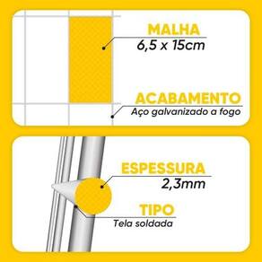 - Marca: DTOOLS Universo do Lar - Material: Metal - Medidas: 25 metros de comprimento x 1,80 metros de altura - Espessura do fio: 2,3mm - Malha: 6,5 x 15cm