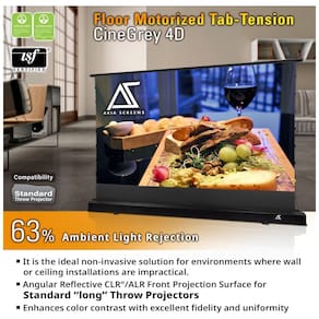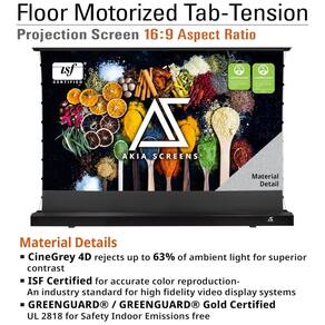 A tela de projeção motorizada floor-rising de 101" da AKIA SCREENS foi desenvolvida para instalação diretamente no piso, indicada para ambientes onde não é possível fixar telas em parede ou teto. A unidade opera em 110V e utiliza material CineGrey 4D com tecnologia de rejeição de luz ambiente, projetado para uso com projetores de longo alcance em salas com iluminação moderadamente controlada.