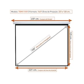 Modelo: TBMS100h. Área de projeção: 221 x 124,5 cm. Dimensões embalada: 10 x 13 x 255 cm. Dimensões do estojo metálico: 07 x 09 x 237 cm. Dimensões em polegadas: 100". Peso da embalagem: 10,5 Kg. Peso do produto: 7,9 Kg. Formato: 16:9 (Wide Screen). Garantia: 12 meses. Bordas: Sim (pretas). Tecido: Matte White 1.1 Código de barras: 7891516997389