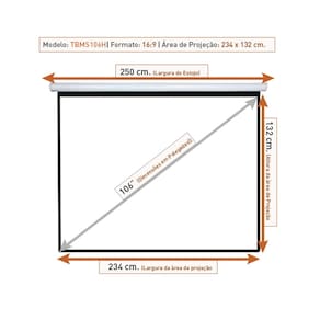 Modelo: TBMS106H Área de projeção: 234,5 x 132 cm Dimensões embalada: 10 x 13 x 272 cm Dimensões do estojo metálico: 07 x 09 x 250 cm Dimensões em polegadas: 106" Peso da embalagem: 11,5 Kg Peso do produto: 8,9 Kg Formato: 16:9 (Wide Screen) Garantia: 12 meses Bordas: Sim (pretas) Tecido: Matte White 1.1 Código de barras: 7897570141270