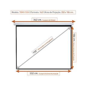 Modelo: TBMS150H. Área de projeção: 332 x 186 cm. Dimensões embalada: 13 x 15 x 365 cm. Dimensões do estojo metálico: 11 x 09 x 342 cm. Dimensões em polegadas: 150". Peso da embalagem: 20,02 Kg. Peso do produto: 17,1 Kg. Formato: 16:9 (Wide Screen). Garantia: 12 meses. Bordas: Sim (pretas). Tecido: Matte White 1.1 Código de barras: 7897570141027