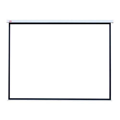 A tela de projeção retrátil Série A da TES possui acionamento manual, estojo em aço carbono na cor branca e pode ser fixada no teto ou na parede.