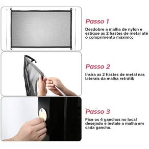 ITENS INCLUSOS: 01 (uma) Tela Pet de Proteção Para Cães; 04 (quatro) Ganchos auto colantes; 02 (dois)Tubos de metal.