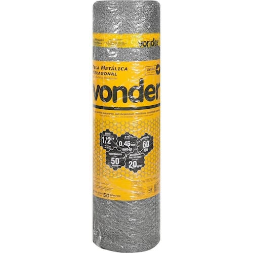 Marca: VonderConteúdo da Embalagem:1 Rolo com 50 mDestaques e diferenciais:Possui perfeito acabamento, com durabilidade, resistência e qualidade superior, além do lacre de de metragem e uma fita de identificação VONDER em toda a extensão do rolo.Aplicações e dicas de uso:Indicada para cercar pássaros. Especial para viveiros.Características Técnicas:Malha da tela metálica hexagonal: 1/2 W1: 14 mm - W2: 30 mm Altura da tela metálica hexagonal: 0,6 m Material da tela metálica hexagonal: Aço carbono Construção da tela metálica hexagonal: Torcida Marca: Não Informado