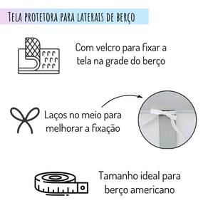 Acompanha: 02 telas laterais para berço americano com 1,25m comprimento x 30cm de altura