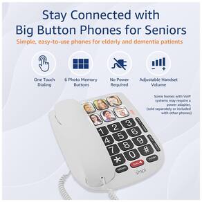 6 teclas de memória de foto de um toque, teclado de botão grande, botões de rediscagem e flash, plástico ABS de última geração e construção de botão Volume alto da campainha e pisca pisca visual, compatível com aparelho auditivo O cabo conector de linha removível para montagem em mesa ou parede funciona mesmo quando há falta de energia. 4 níveis de volume do fone de ouvido amplifica o som de entrada em até 85 decibéis, 3 configurações de volume da campainha campainha alta 75 dB Memória fotográfica mantida mesmo quando o telefone é desconectado. Programe em casa e traga para o seu ente querido sem preocupações telefone analógico, não comparável aos sistemas VoIP Voice over Internet Protocols Marca: Não Informado