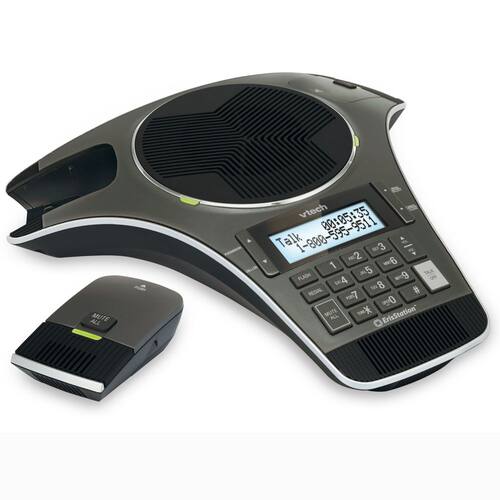 USBVTech Telefone de conferência VCS702 ErisStation DECT 6.0 com dois microfones sem fio usando tecnologia sem fio Orbitlink - Inclui 2 microfones sem fio DECT 6.0 e 1 microfone fixo central. - Tela retroiluminada de 2 linhas com data e hora economiza até 50 entradas CID e 50 entradas de nome/número. - O viva-voz central full-duplex na base permite que as pessoas falem e sejam ouvidas ao mesmo tempo, assim como fariam em uma reunião cara a cara. - Os compartimentos de carregamento magnético embutidos na base mantêm os microfones sem fio juntos e prontos para a próxima chamada. - Os microfones sem fio têm até 70 horas de vida útil da bateria com 8 horas de tempo de conversação.