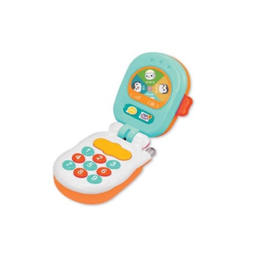 Cinco diferentes canções, tecla numérica emite som e acende a luz da antena ao apertar. Com estampa colorida, desenho de pinguins.