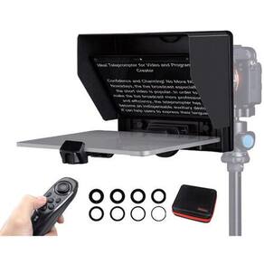 O teleprompter tp portátil feelworld tp10 suporta o uso de smartphone/tablet suporta tablets de até 11 e gravações de smartphone/dslr/dslm graças a fixadores bem pensados e um suporte ajustável até 6 cm . Possui para-sol de tecido removível, anéis de espuma e um controle remoto bluetooth que se comunica com os aplicativos feelworld android/ios. Design dobrável com feixe padrão de 10 polegadas