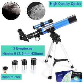 Telescópio Refrator Portátil com Escopo Finder O presente perfeito para crianças e iniciantes em astronomia para explorar o universo e a natureza, a Óptica de Alta Qualidade torna sua visão mais brilhante, mais clara e oferece imagens nítidas. Telescópio lunar infantil F400X40 com espelho lunar Inclui 3 peças oculares intercambiáveis H20mm, H12.5mm, H6mm que você pode desfrutar de diferentes potências de ampliação. Telescópio de viagem com distância focal de bússola embutida no tubo do telescópio, o escopo do localizador ajuda você a direcionar objetos com mais rapidez e facilidade. Telescópio de ciência educacional fácil de montar e usar vem com mapa de lua e estrela, telescópio leve e portátil adequado para viagens em família para trazer muita diversão e alegria para as crianças Marca: Não Informado