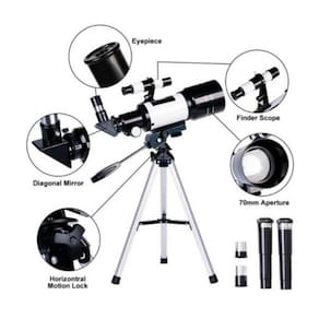 Telescópio Astronômico Monocular 300X70 Veja como o espaço é maravilhoso, com este poderoso telescópio, ideal para movê-lo de lugares diferentes e contemplar objetos a curto e longo alcance. Graças ao tripé incluído, ele permitirá que você deixe seu telescópio es. Descrição: Sistema óptico: Óptica refratária de contraste de imagem e transmissão de luz multirrevestida. Distância focal: 300 mm Diâmetro da lente: 70 mm (3 oculares): H20mm, H12,5 mm, SR4mm. Lente Barlow: 3x Margem de ampliação: 15x - 150x (4 níveis de aumento em combinação: 15x, 50x, 45x, 150x). Híbridos diagonais: amplo campo de visão rico em 90 °/. Distância de foco próxima: aproximadamente 3 mm Comprimento do corpo principal: 31 cm (excluindo ocular) Rápido de instalar e fácil de usar. NOTA: O localizador de telescópios Red Dot não está incluídoPrincipais características: o ponto laser vermelho ajuda a localizar a lente “estrela” de 21 mm e o visor de 19 mm. CUIDADO: Não olhe diretamente para o sol com este telescópio, pois ele pode causar lesões oculares graves. Conteúdo: 1 tubo telescópico, 1 espelho diagonal, 1 olho H6 mm, 1 olho H20 mm, 1 lente Barlow, 1 ocular ereta, 1 tripé de alumínio, 1 configuração de tripé