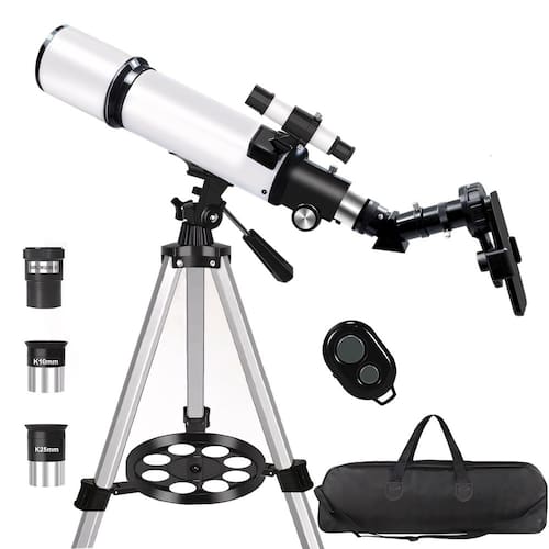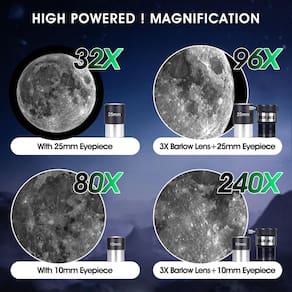 - Óptica superior: telescópio com lente objetiva de grande abertura de 80 mm fornece uma imagem mais clara e brilhante, distância focal de 600 mm, vidro óptico totalmente revestido com maior brilho e clareza, proteja seus olhos, telescópio refrator perfeito para iniciantes em astronomia ou crianças explorarem os interststícios celular, também telescópio para adultos de alta potência - Alta ampliação telescópios: Este é um ótimo telescópio para crianças, bem como telescópios para astronomia de adultos. O telescópio para astronomia vem com uma lente Barlow 3X e duas oculares, H25mm e H10mm, a ampliação varia de 60X a 150X. Você pode escolher livremente diferentes combinações para aproveitar as diferentes distâncias. Os telescópios também vêm com uma luneta de 5x24 para localização precisa