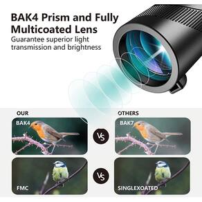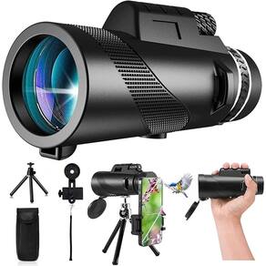 Telescópio monocular 80x100 de alta potência para smartphone Monóculos para adultos Telescópio monocular de alta definição para observação de estrelas, caça, vida selvagem, observação de pássaros, viagens, acampamento, caminhada -?Ampliação HD de 80 × 100?Ampliação de 80 vezes, monocular de 100 mm de diâmetro do objeto. Usando tecnologia óptica, este monocular usa uma lente totalmente revestida para garantir excelente transmitância de luz e brilho da imagem, para que seu campo de visão seja mais claro, a imagem seja mais clara e nítida e não haja listras pretas. -?Monocular compacto?O monocular compacto e leve traz para você a paisagem distante ajustando o copo ocular e a roda de foco. Esta única ocular é pequena e leve. Pode ser utilizado com uma mão e é fácil de executar. -?Compatível com qualquer smartphone?É equipado com um suporte de smartphone de posicionamento rápido e um tripé. Ele pode ser combinado com vários modelos de telefones celulares. É fácil de instalar, controlar remotamente o monocular e fornecer imagens de alta definição para compartilhar com os amigos. -?Imagens de alto contraste e resolução?O telescópio zoom é equipado com prisma BAK-4 e lente totalmente multirrevestida, garantindo transmissão de luz e brilho superiores. A transmissão de luz atinge até 99,5% de visibilidade. A visão noturna embutida com baixo nível de luz ajuda você a ver as coisas com pouca luz. Um protetor ocular ajustável também permite que você gire para cima e para baixo com facilidade e rapidez para uma visualização ideal, mesmo usando óculos. -?Ampla aplicabilidade?Este monocular 80 × 100 é adequado para adultos e crianças. Ele fornece imagens e visão claras e brilhantes, também é adequado para caça, alpinismo, caminhadas, observação de animais, camping, turismo, shows, jogos de bola, visualização, condução, exploração ao ar livre e outras atividades. Você pode apreciar a bela paisagem à distância.