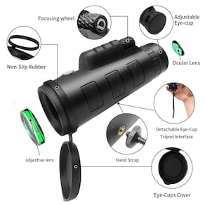 Telescópio monocular para adultos - Ampliação HD 80 × 100: ampliação de 80 vezes, monóculo de 100 mm de diâmetro do objeto. Usando tecnologia óptica, este monóculo usa uma lente totalmente revestida para garantir excelente transmissão de luz e brilho da imagem, para que seu campo de visão seja mais brilhante, a imagem seja mais clara e nítida e não haja listras pretas. - Fácil de instalar e usar: o telescópio monocular para smartphone equipado com um adaptador de smartphone de posicionamento rápido e tripé. Fácil de instalar, pode combinar com vários modelos de telefones celulares. O uso dos telescópios com um tripé e um smartphone pode tornar a imagem mais estável e a distância de visualização mais longa. - Ótica de alta qualidade: monóculo de foco de zoom HD com ótica de alta qualidade, prisma BAK-4, lente FMC e uma lente totalmente multirevestida, que reduz efetivamente a perda de refração de luz e garante mais transmissão de luz, e oferece imagens claras e brilhantes - Compatível com qualquer smartphone: é equipado com um suporte de smartphone de posicionamento rápido e um tripé. Pode ser combinado com vários modelos de telefones celulares. É fácil de instalar, controla remotamente o monóculo e fornece imagens de alta definição para compartilhar com amigos. - Excelente presente: este monóculo é um excelente presente para o Dia dos Pais, Natal, aniversários e muito mais. É adequado para uma variedade de esportes ao ar livre: caça, observação de animais, montanhismo, acampamento, viagens, caminhadas, esportes aquáticos, jogos de bola, cenários, monitoramento, exploração ao ar livre e outras atividades