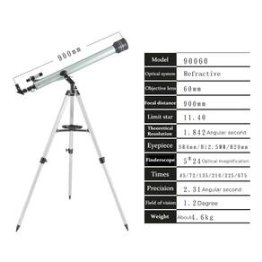 Abertura clara: 60 mm (aproximadamente 2,4 polegadas) Distância focal: até 900 mm Alcance visual: 11,40 Resolução teórica: 1,842 segundos de arco.Potência de coleta de luz: 0,109. Alcance: 5x24,90 grau espelho central Tripé de alumínio ajustável, altura superior: 125 cmBandeira de caixa de acessórios.Multiplicadores máx.: 675 vezesPara los otros multiples posibles: (la distancia focal es de hasta 900mm) Ocular SR4mm solamente = 900/4 = 225 veces. Emparelhado com 3 vezes a lente = 225*3 = 675 vezes. (Bueno para la observación astronómica) Ocular H12.5mm sólo = 900/12.5 = 72 vezes. Emparelhado com 3 vezes a lente = 72*3 = 216 vezes. (Bom para ver a distância) Ocular H20mm só = 900/20 = 45 vezes. Emparelhado com 3 vezes a lente = 45*3 = 135 vezes. (Bueno para turismo) Ocular H20mm só = 900/20 = 45 vezes. Emparelhado com 3 vezes a lente = 45*3 = 135 vezes. (Bom para turismo)