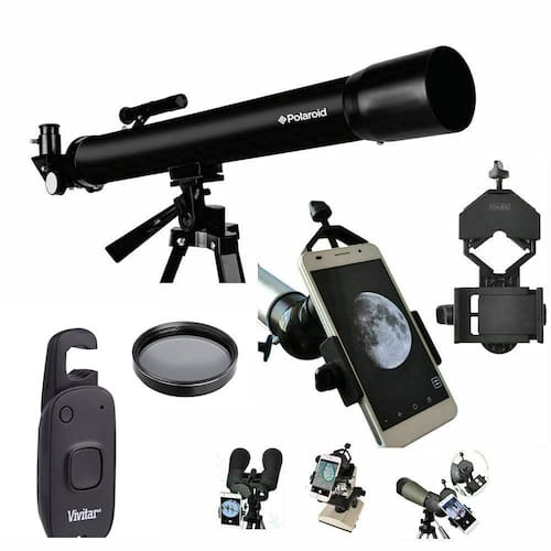 Telescópio avançado Este telescópio refrator apresenta várias opções de ampliação: 56x, 84x, 168x, 175x, 262x e 525x. Ele permite o controle de câmera lenta para ajustes precisos e apresenta uma construção leve e durável. Na caixa O telescópio refrator Polaroid 168x/525x vem com um tripé ajustável de tamanho normal, duas oculares intercambiáveis 4 e 12,5, uma lente de 60 mm, uma lente Barlow 3x, uma ocular ereta de 1,5x e um localizador de 5x. O telescópio inclui montagem em altitude e azimute! - Como bônus, um mapa estelar e um filtro lunar estão incluídos! TRIPÉ: tripé ajustável de tamanho normal inclui montagem em altitude e azimute - O ADAPTADOR DE SMARTPHONE FUNCIONA COM TODOS OS SMARTPHONES - OBTURADOR REMOTO BLUETOOTH PARA SMARTPHONE - AMPLIAÇÃO: várias opções de ampliação: 56x, 84x, 168x, 175x, 262x, 525x - A LENTE BARLOW 3X ESTÁ INCLUÍDA + OCULAR 5X