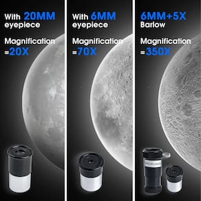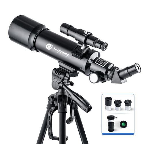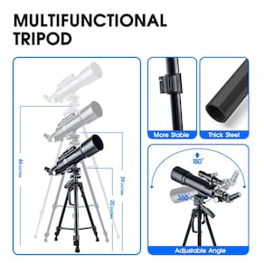 Encontre suas próprias estrelas no céu com o telescópio astronômico YUANZIMOO! Especificação: Tipo de telescópio: refrator Abertura: 70 mm Distância focal: 400 mm Ocular: K25 mm: 28X, K10 mm: 70X Tripé: tripé de aço inoxidável ajustável Lente Barlow: 3X -?Ótica de qualidade?O telescópio astronômico possui uma abertura 70 mm maior que permite a entrada de mais luz, as imagens serão mais brilhantes e fornecerão um amplo campo de visão. Distância focal de 400 mm, totalmente revestida vidro óptico com alta transmissão, alto brilho e clareza -?Telescópio de alta potência?Telescópio astronômico com oculares de alta qualidade (20 mm, 12 mm, 6 mm), uma lente Barlow 5x, a a ampliação varia de 20x-350x. Adequado para observação de estrelas e visualização diurna e noturna -?Espelho zênite giratório?O espelho zênite giratório de 360°, conectado à ocular, pode atingir diferentes ângulos de observação astronômica, adequado para crianças e adultos. O telescópio refrator também vem com uma luneta 5X20 para uma localização precisa e, ao mesmo tempo, a luneta também pode ser usada como um telescópio monocular -?Tripé ajustável?A altura do tripé varia de 20 “a 46" para diferentes posições de visualização. O telescópio usa um tripé de alumínio mais estável; quando você encontra seu alvo, ele não se move facilmente -?Fácil de operar?O telescópio portátil é fácil de instalar, fornecemos um conjunto completo de manuais de instalação. Nenhuma ferramenta é necessária, mesmo para o primeiro uso
