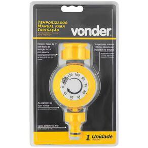 Descrição do Produto: Temporizador Manual Para Irrigação Vonder Indicado para programar o tempo da irrigação, sendo ligado diretamente na rede de água. Para programação, basta rotacionar o botão superior conforme o tempo desejado. Não utiliza pilhas ou baterias, tem fácil montagem e instalação, além de proporcionar o fechamento automático da água ao final do ciclo. - Material: Plástico - Pressão máxima PSI : 6 bar - 87 lbf/pol² psi - Conexão de entrada: Rosca de 1 com bucha de redução de 3/4 com peneira - Conexão de saída: Conector de 1/2 - Tipo de acionamento: Manual - Tempo máximo: 120 minutos 2 horas - Graduação: 15 minutos Ean: 7893946553197
