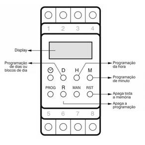 Características Técnicas -Tensão: 220 VCA ? 50 / 60 Hz; -Temperatura ambiente de operação: TA= 0 a 40ºC; -Consumo próprio máximo: 0,7 Watts; -Até 16 programações: 8 para ON e 8 para OFF; -Tipos de programações: Horária (horas, minutos e segundos), diária e semanal; -Fixação: trilho DIN 35 mm; -Dimensões: (C x L x A): 92 x 35 x 60 mm; -Bateria interna: Ni-MH 1,2 V / 80 mAh ? recarregável; -Fator de deslocamento indutivo: > 0,5 ( Fp > 0,5 ? Thd < 10%); -Suporta motores até ½ HP