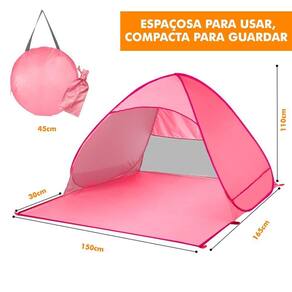 Destaques Costura de alta qualidade Proteção contra raios UV e resistente a água Leve e compacto – Fácil de guardar e transportar Montagem instantânea pop-up Prático – Fácil de montar e desmontar Proporciona a sensação de privacidade Pode ser utilizado em ambientes internos e externos Janela de ventilação Capacidade para até 2 Adultos Bolsos laterais para colocar peso/areia