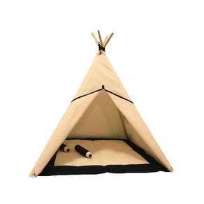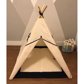 descrição da tenda: - confeccionada em tecido algodão cru com detalhe na barrinha da porta azul marinho - medidas aproximadas: 1,35m x 1,10m x 1,10m altura até o topo da madeira x largura x profundidade