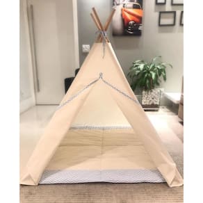 Empresa especializada em fabricar produtos lúdico, onde visamos a interação das crianças com seus pais, pode ser brincando junto na cabana ou contando uma historia para seus filhos dentro dela. Historia da tenda :A tenda vem do conceito tipi que provém da língua dos índios dakota. É composto por duas sílabas, ti que significa viver e pi que é a terminação de substantivos da língua. Tipi significa então casa, sítio de vivência, residência Produtos 100% - original - novo Fabricação própria 100% nacional Itens incluso no kit: - tenda- tapete acolchoado - fita para amarração das madeiras- bastão em madeira de reflorestamento - manual de montagem e manutenção Descrição da tenda: - confeccionada em tecido algodão cru com detalhe na barrinha em chevron cinza- medidas aproximadas: 1,35m x 0,90m x 0,90m (altura até o topo da madeira x largura x profundidade) Estrutura da tenda: - madeira pinus na medida 1,50 m Os bastões são colocados embutidos na tenda de tecido dando maior conforto e segurança para as crianças Descrição do tapete: - confeccionado em tecido algodão cru com borda em chevron cinza - enchimento em manta acrílica gramatura 200 - medida: 0,90m x 0,90m (largura x profundidade) Marca: Atelie Luara