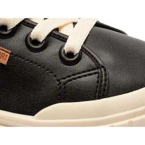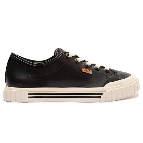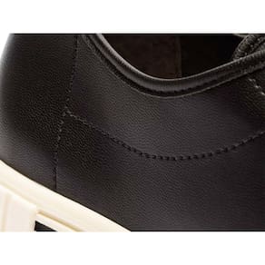 Tênis Alê de amarrar preto. O tênis Anacapri de amarração vem para a temporada em material similar ao couro com design de faixas geométricas em pespontos delicados por todo o cabedal. Com atacadores brancos, apresenta solado baixo emborrachado e texturizado na biqueira e parte traseira, com detalhe em duas listras pretas na lateral. Com aplicação de tag marrom Anacapri na lateral. Contorno em fita e puxador na parte traseira, facilitando o calce.