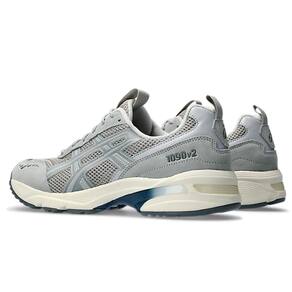 O tênis GEL-1090 V2 traz desde 2003 onde foi reprojetado com visual moderno. Ele foi redesenhado com sobreposições de camurça e presilhas no calcanhar nas costas para um visual mais contemporâneo. Semelhante ao movimento de uma bandeira quadriculada, linhas extensas aparecem ao longo da entressola. Enquanto isso, o calcanhar é revestido com tecnologia GEL para melhorar o conforto.