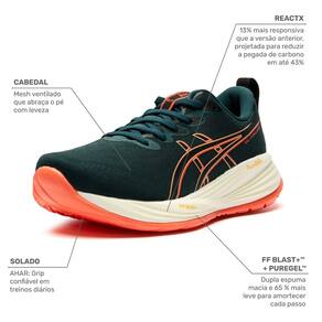 A entressola em EVA com a avançada tecnologia FF BLAST+ ECO proporciona amortecimento responsivo e transições suaves, reduzindo o impacto em cada passada. Já o PureGEL oferece absorção extra de choques, tornando a corrida mais fluida e confortável.