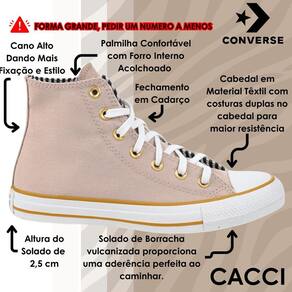 O tradicional Chuck Taylor All Star chega nesta coleção Play On Fashion com elementos da moda utilitária e do handmade, entregando mais atitude e estilo ao look. Vem confeccionado em tecido twill, com costuras duplas no cabedal para maior resistência, dois ilhoses laterais para uma transpiração adequada aos pés e forro interno acolchoado para maior conforto. O Patch Logo com assinatura Converse Chuck Taylor All Star é aplicado na parte interna dos canos, enquanto o logo Converse All Star é aplicado na heeltab do calcanhar. O solado de borracha vulcanizada garante mais aderência a cada passo.