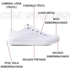 - Cabedal feito com material lona - Altura média do cano 12,5cm. - Solado feito com emborrachado pvc - Palmilha feita de eva de 3mm forrado - Lado interno com dois ilhos, para melhor respiração dos pés