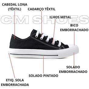 - Cabedal feito com material lona - Altura média do cano 12,5cm. - Solado feito com emborrachado pvc - Palmilha feita de eva de 3mm forrado - Lado interno com dois ilhos, para melhor respiração dos pés