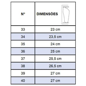 Recomendações de Uso: A limpeza do calçado pode ser feita com Detergente neutro e pano úmido. Não deixar submerso em água e não utilizar nenhuma forma de calor para secar. Guardar em local sem umidade.