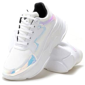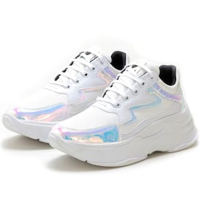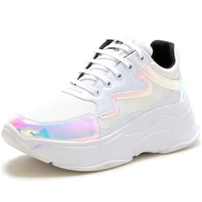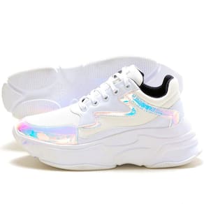 Tênis Feminino Chunky, Tendência entre as blogueiras, lançamento 2020, branco nada básico com cores holográficas. palmilha confortável em EVA macio, amarração em cadarço, solado antiderrapante macio e leve. leve Ideal para o dia a dia!