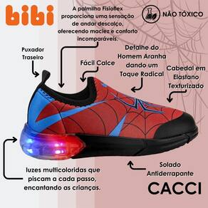 Tênis Infantil Menino Menino Aranha Bibi Space com Luz de Led é um calçado vibrante, projetado para se destacar em qualquer ambiente, ele também oferece uma experiência única com suas luzes coloridas no solado, que piscam a cada passo. Feito com elastano, proporciona um ajuste excepcional aos pés das crianças, garantindo conforto e flexibilidade ao longo do dia. Sua facilidade de calce é um ponto positivo tanto para os pequenos quanto para os pais, tornando o processo de vestir os sapatos mais rápido e simples. A palmilha fisioflex, tão macia quanto caminhar descalço, não só proporciona conforto imediato, mas também auxilia no desenvolvimento saudável dos pés em crescimento. Isso faz do Space não apenas um calçado divertido, mas também uma escolha consciente para o bem-estar dos meninos.