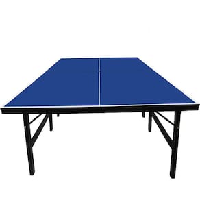 Tênis de mesa com campo de jogo confeccionado em MDP de 15 mm de espessura e com acabamento em primer azul e linhas demarcatórias na cor branca, possui pés dobráveis em madeira maciça e medidas oficiais que atendem aos padrões da ITTF (International Table Tennis Federation).