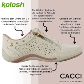 De calce fácil, traz elásticos e um zíper funcional lateral, para melhor ajuste e conforto, além de pequenos microfuros na região frontal, permitindo melhor transpiração do pé no calçado. Conta também com a tecnologia da palmilha com cunho em gel, com maior absorção de impacto durante a pisada, atuando na melhor distribuição do peso e auxiliando na postura corporal.