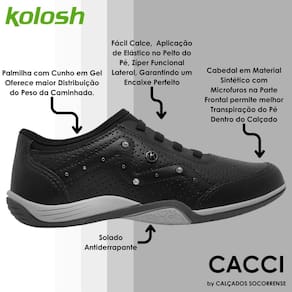 O Tênis Kolosh Casual é projetado para ser fácil de usar, graças ao elástico no peito do pé que garante o calce fácil. Além disso, é prático para usar no dia a dia, com sua superfície fluida, trazendo a aplicação de brilhos e detalhes metalizados na lateral, além dos microfuros para ajudar na transpiração.